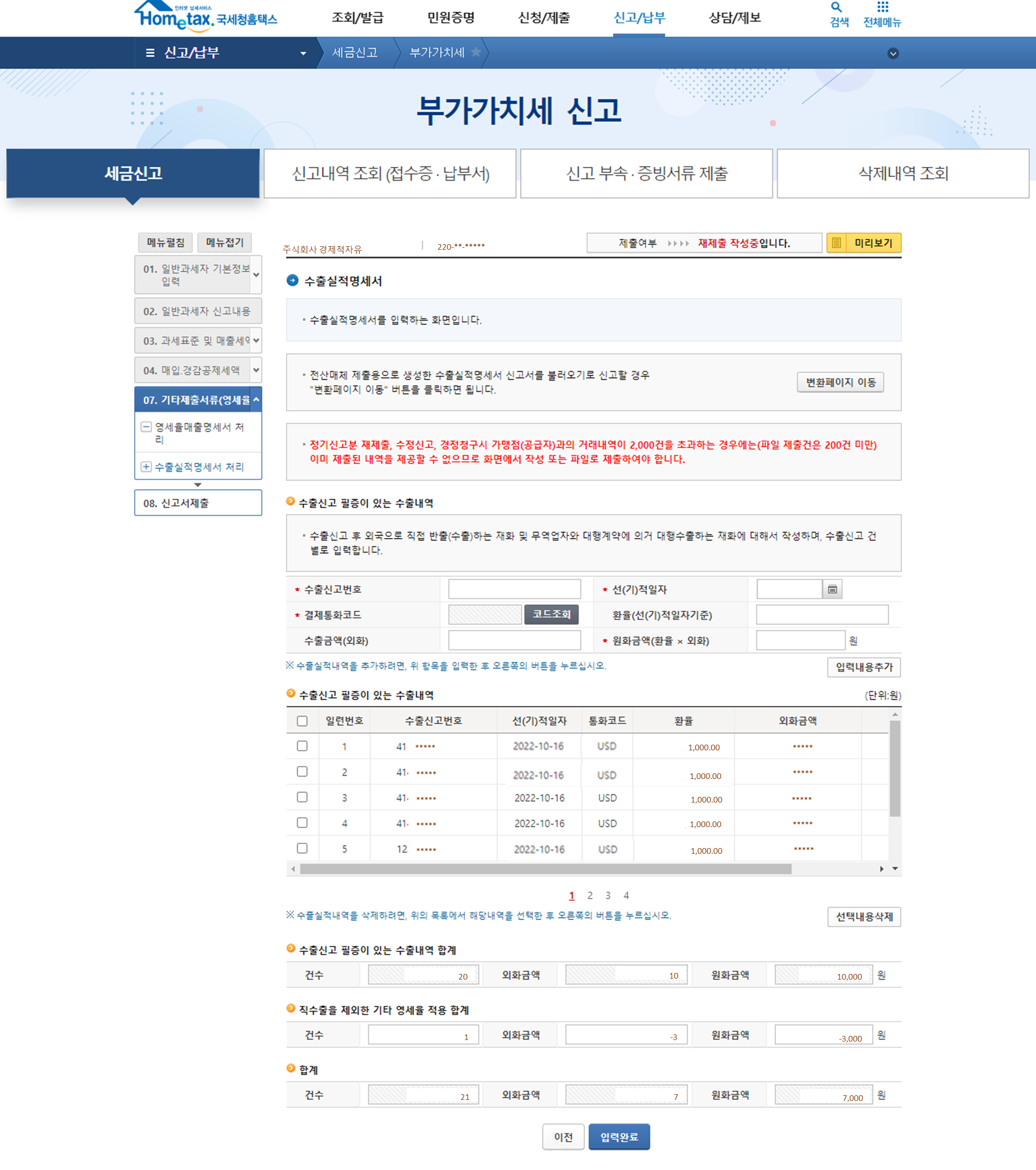 홈택스에서 수출매출을 기입할때 수출면장이 있는 수출건은 '수출신고 필증이 있는 수출내역'에 수출금액 10,000원 그리고 수출면장이 없는 수출매출건은 '직수출을 제외한 기타 영세율 합계에 수입면장을 받은 반품건에 대한 금액 3,000원을 넣으시면 됩니다.