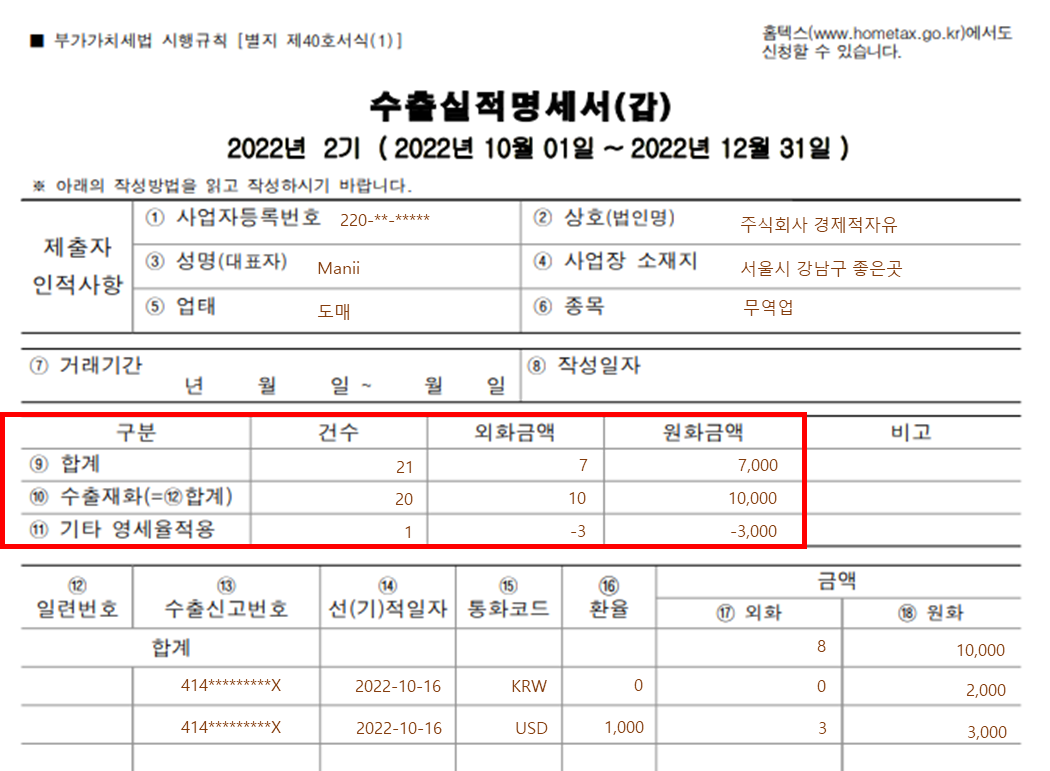 수출가액이 원화인 경우 환율과 외화금액에는 0 으로 입력합니다. 즉 외화금액에는 금액을 넣지 않고 원화금액에만 입력합니다. 자세한 신고방법은 다음 게시글에서 설명하도록 하겠습니다.