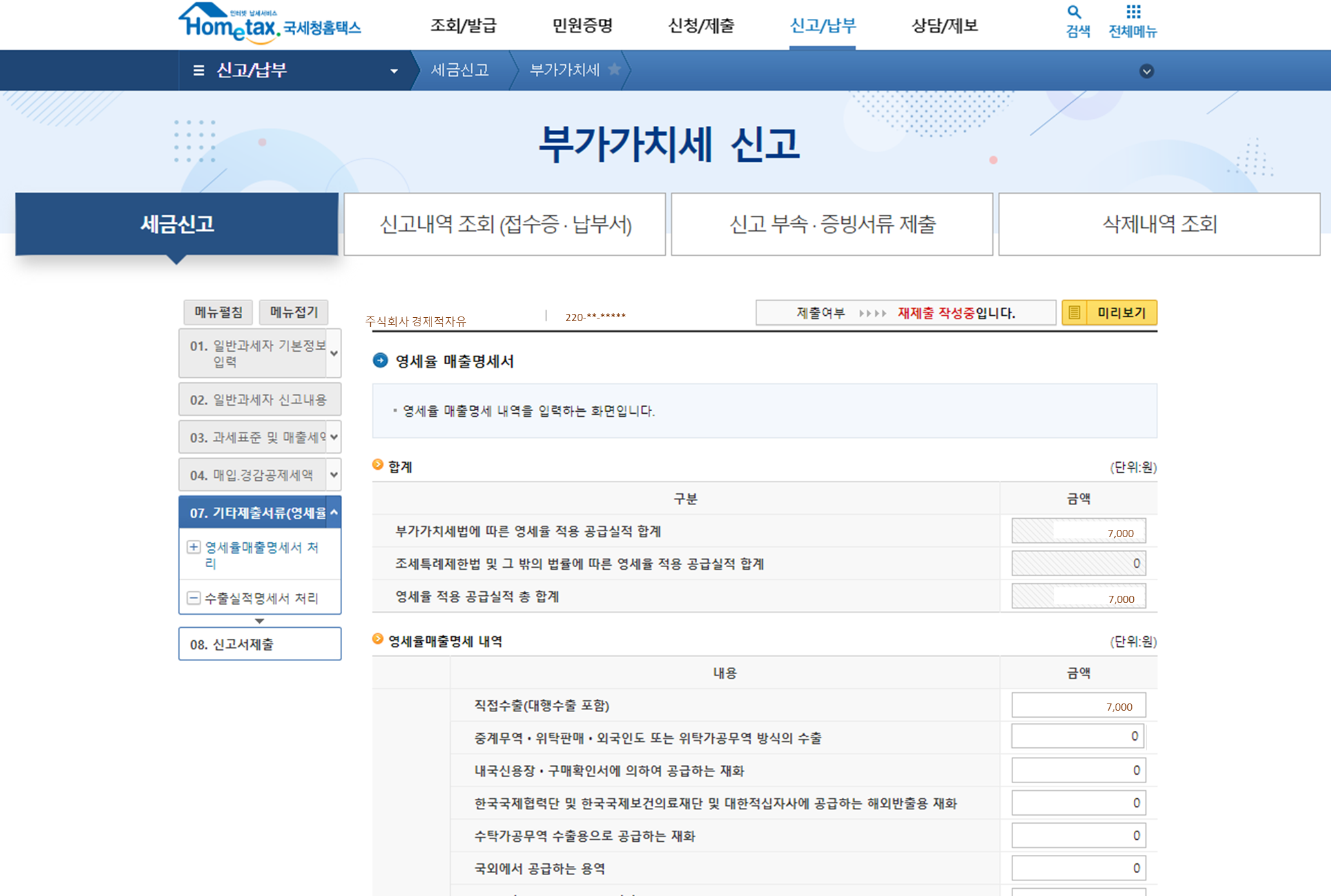 2) 기타제출서류>영세율매출명세서