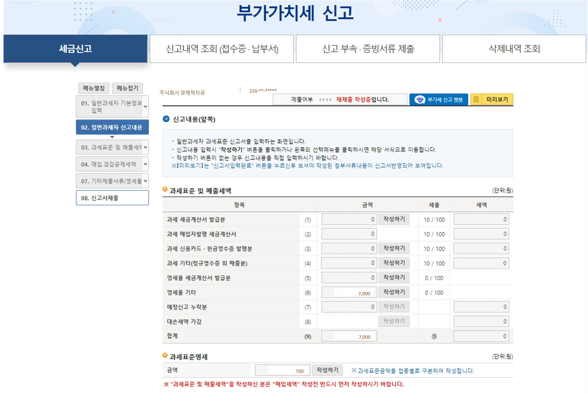 일반과세자 부가가치세 신고서>과세표준 및 매출세액에서 영세율>기타에 7,000원(순액)을 넣습니다.