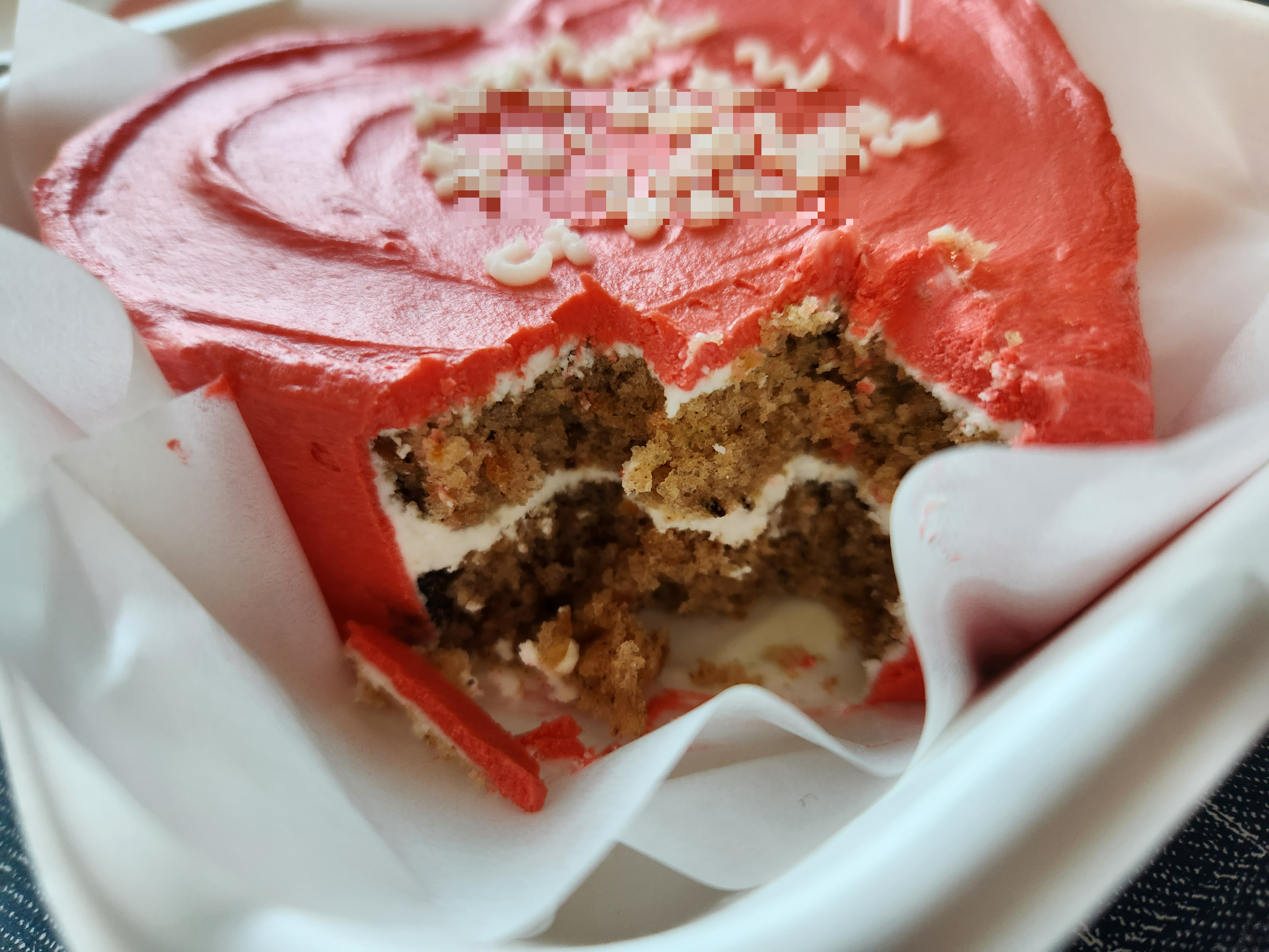 짠~ 케이크가 너무 예뻐요. 색은 사진보다 조금 연한 다홍색이에요. 저는 정말 만족했어요. 케이크는 크림치즈와 당근이 어우러져서 너무 달지 않은 담백한 맛이었습니다!