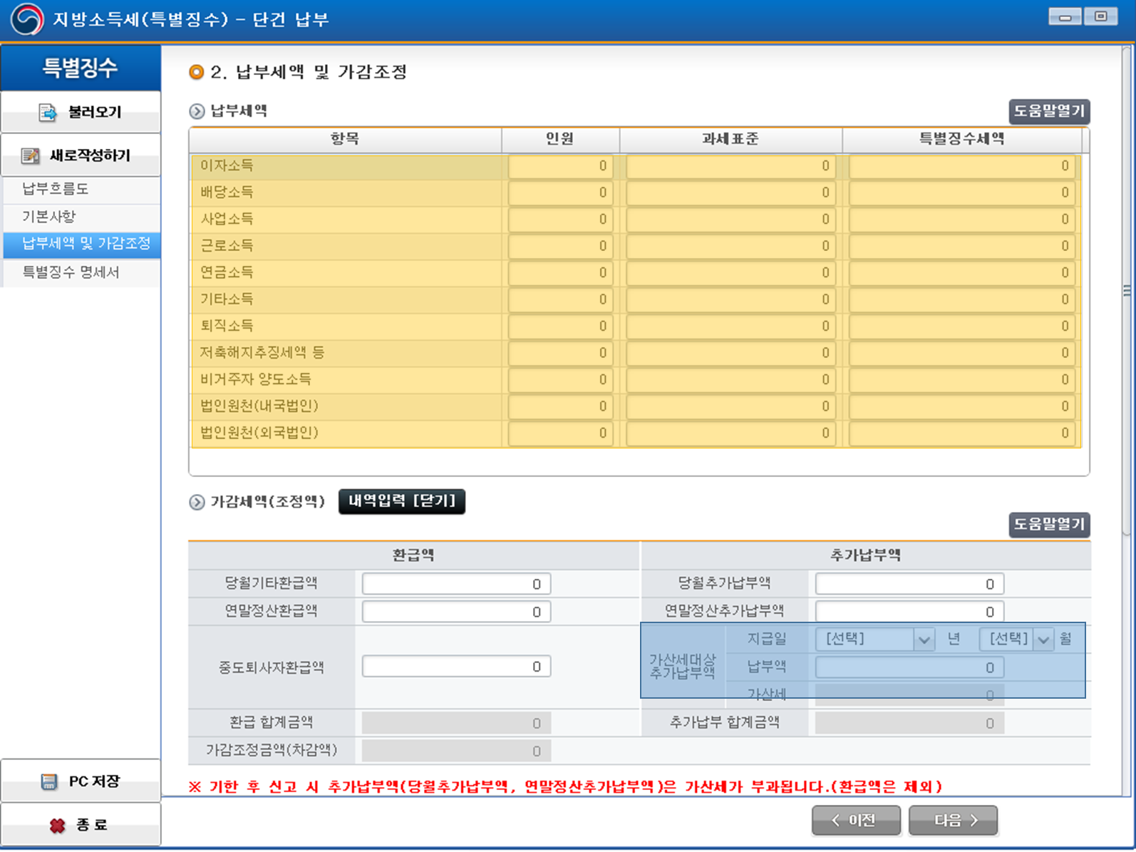 아래 노란 부분에 정기신고건을 입력하고, 파란 부분에 추가납부할 세액과 원 지급일을 기입합니다. 가산세는 오늘을 지급일로 생각하여 자동계산되어 나옵니다.