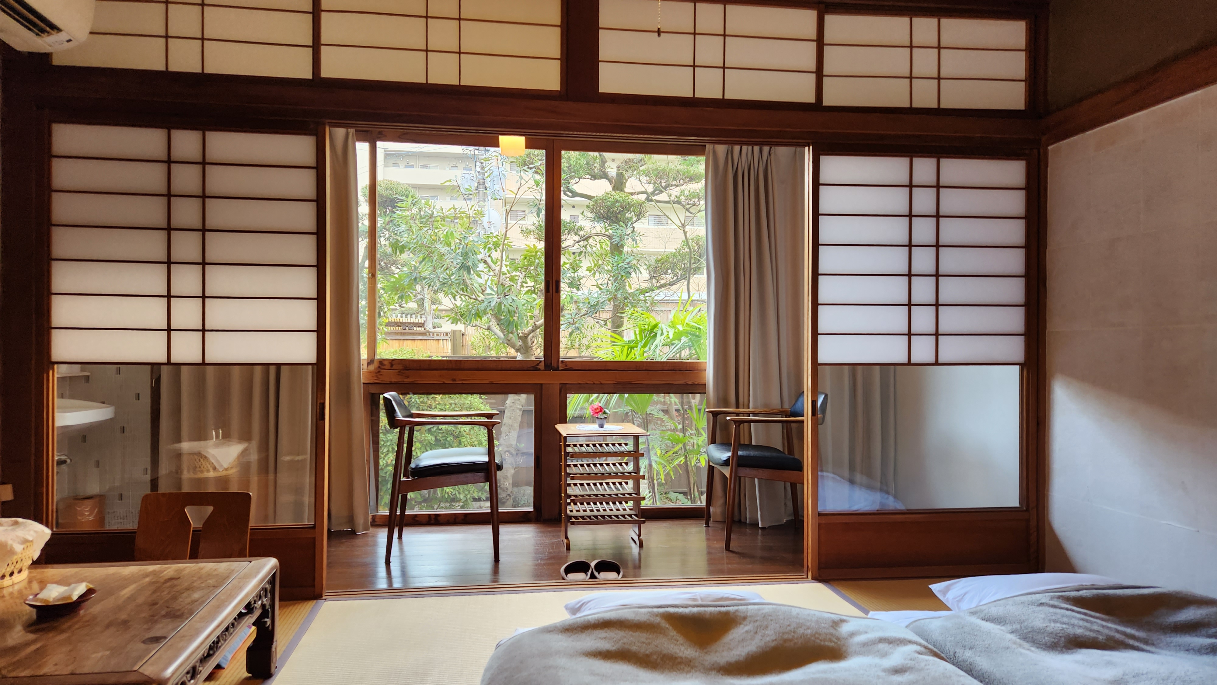 아침에 온천을 하고 방으로 와서 창문을 열고 저기 테이블이랑 의자에서