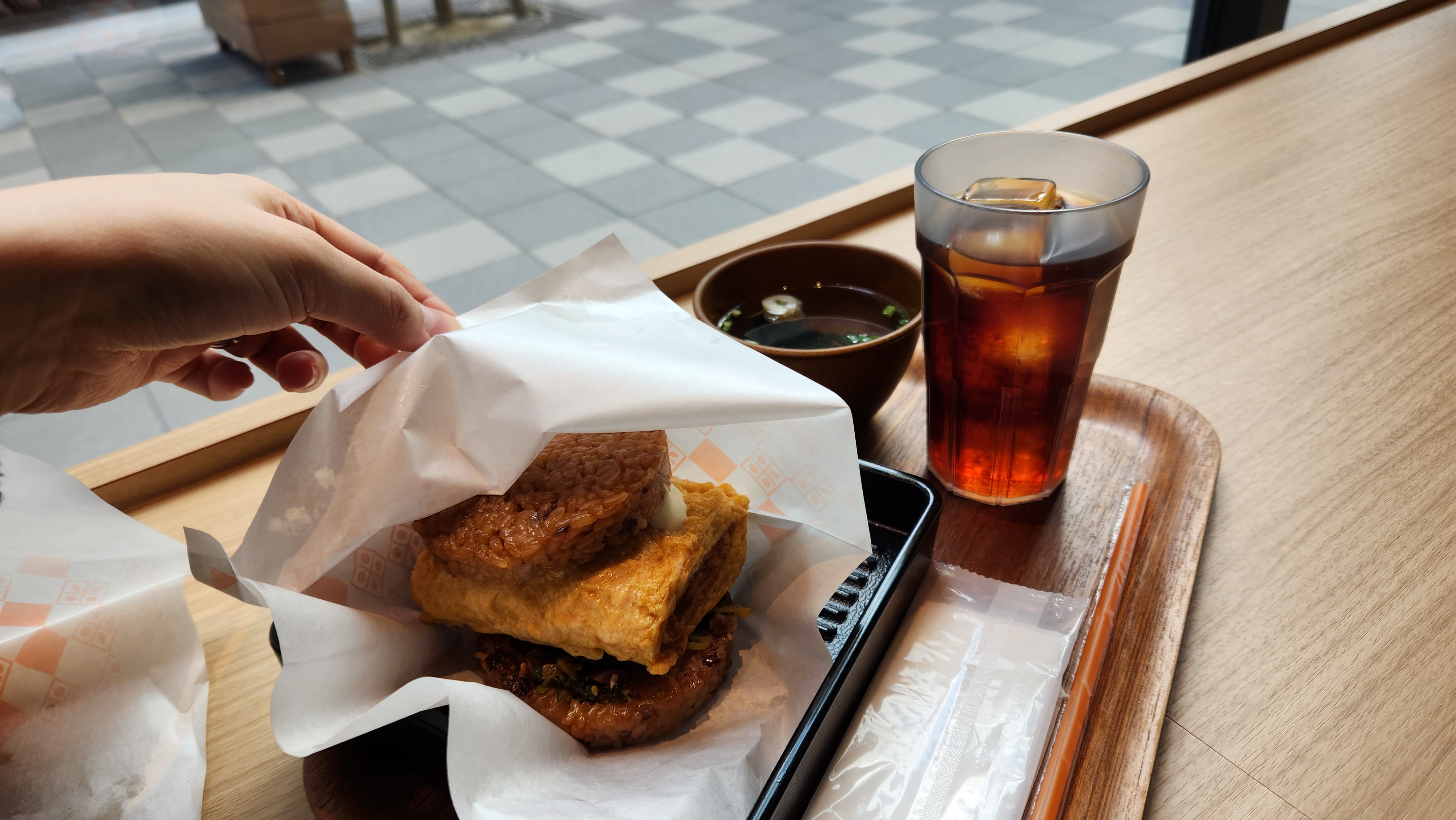 저는 친구와 명란계란과 야채가 들어간 라이스 버거 각각 하나씩과 + 미소장국 + 커피를 골랐습니다.