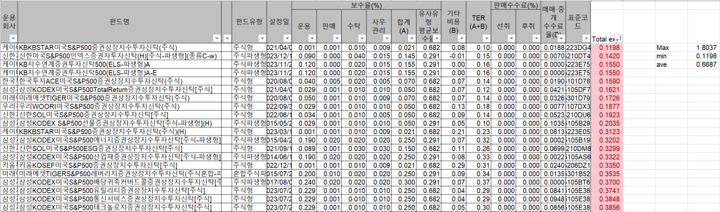 저는 총비용을 알고 싶었기 때문에 펀드 관련 수수료인 보수비용, 기타 비용, 매매중개수수료율을 모두 더해 Total expense를 구했습니다. 그리고 최소값과 평균 사이값은 붉은색으로 칠하고, 총비용 칼럼을 작은 금액순으로 정렬시켰습니다. 23년 말 기준으로 수수료가 가장 비싼 건 1.8037%, 가장 저렴한 건 0.1198%, 평균값은 0.6687%입니다.