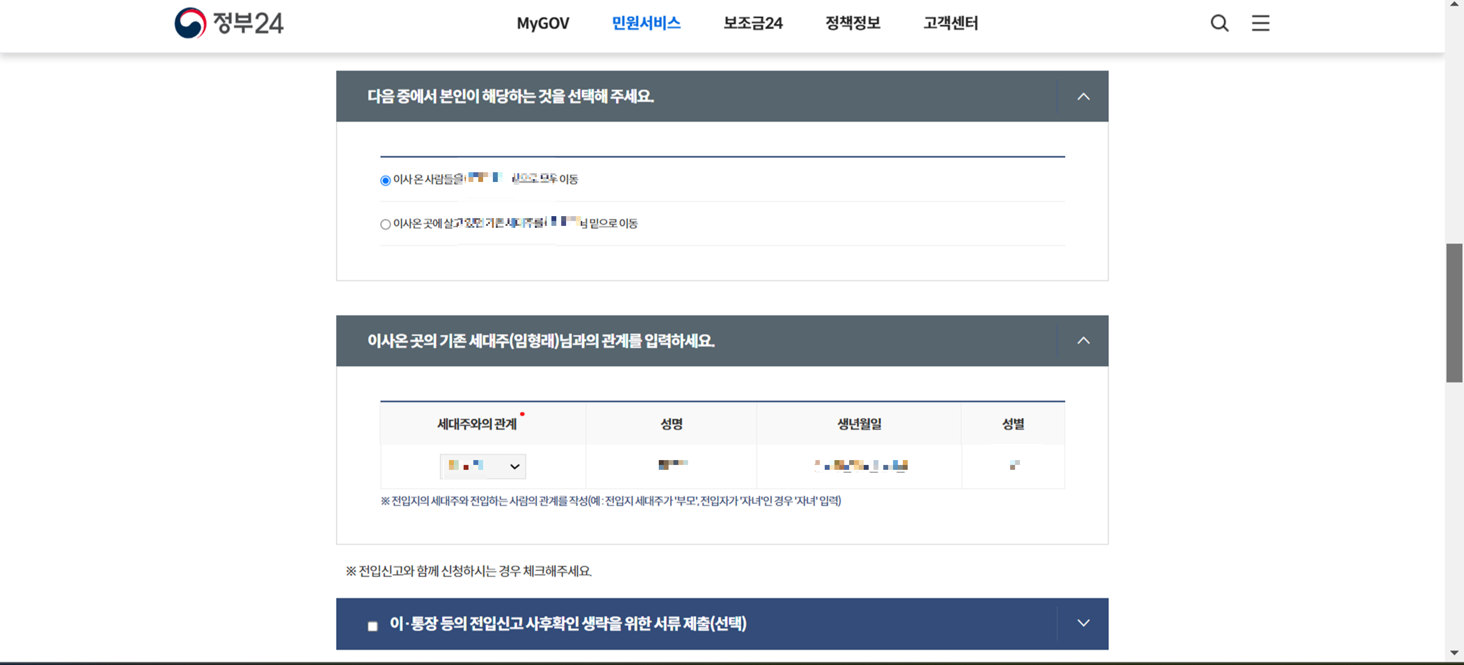 저는 남편이 먼저 전입신고를 하고 그 아래 세대원으로 들어가는 경우라 "이사 온 곳에 기존에 살고 있는 세대주가 있는 경우"를 선택했습니다. 만약 가족들이 처음으로 전입하는 경우라면 "이사 온 사람끼리 세대구성"을 선택해야겠죠?