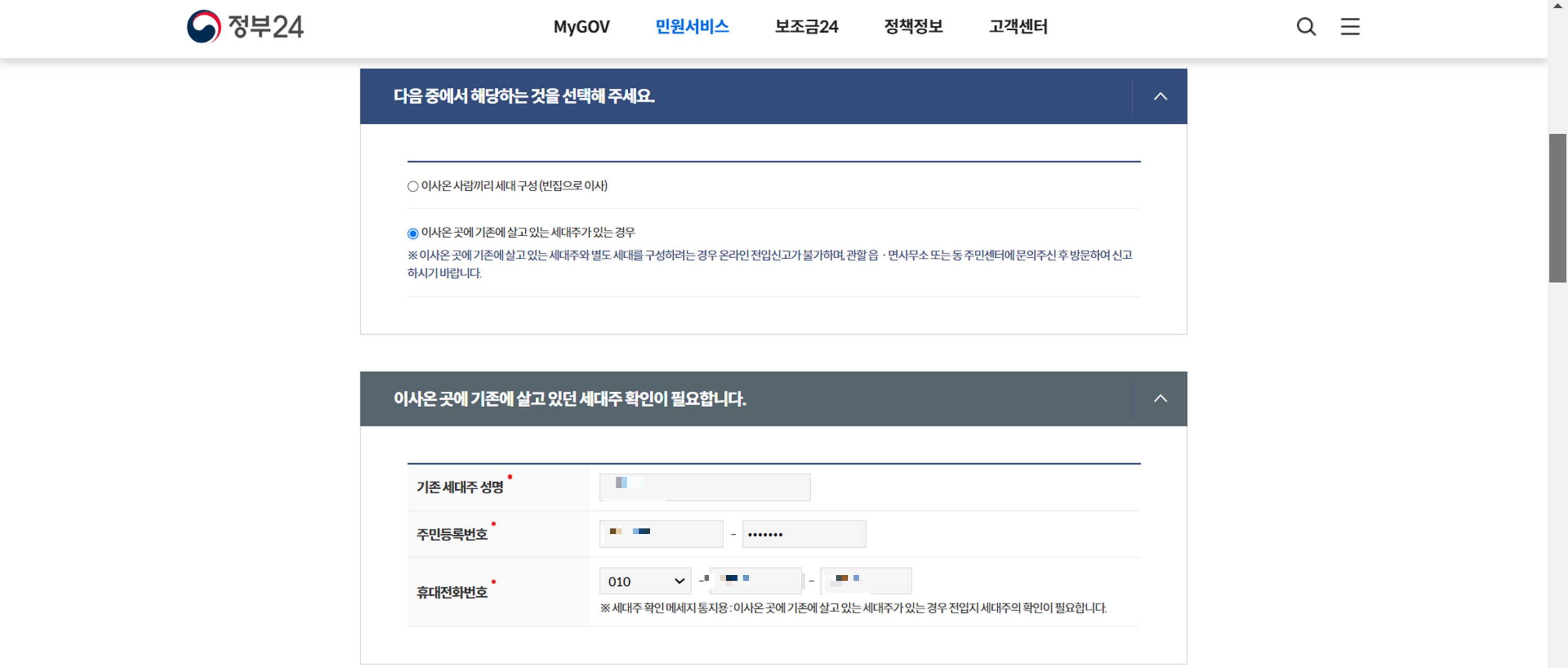 5. 이사 온 사람들을 기존 등록되어 있는 세대주(저의 경우 남편) 아래 세대원으로 등록할지, 아니면 새로 전입신고하는 제가 세대주가 될지 선택하는 부분입니다. 저는 남편이 세대주를 하기로 해서 기존 세대주 아래 이동으로 선택했습니다.