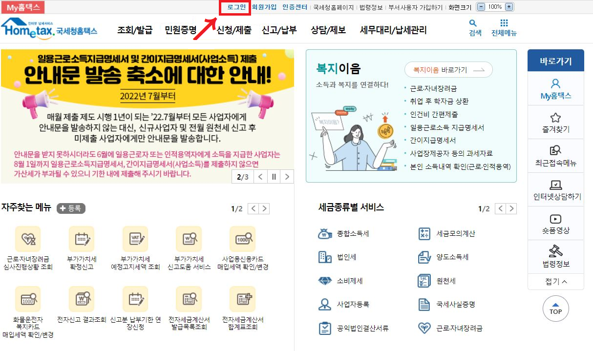 1. 홈택스에 들어가 로그인을 합니다.