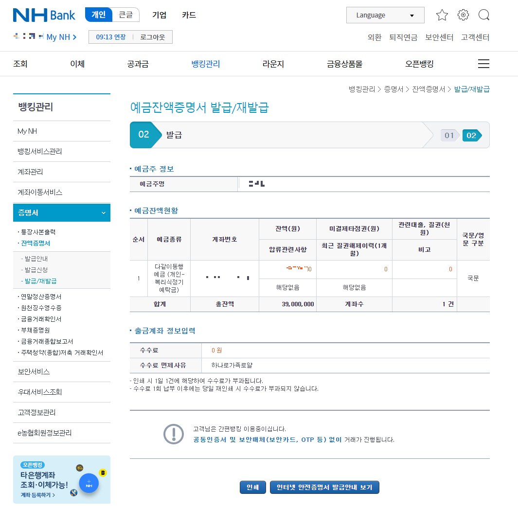 * 예금잔액증명서 발급은 신청일 당일에 한해 가능함