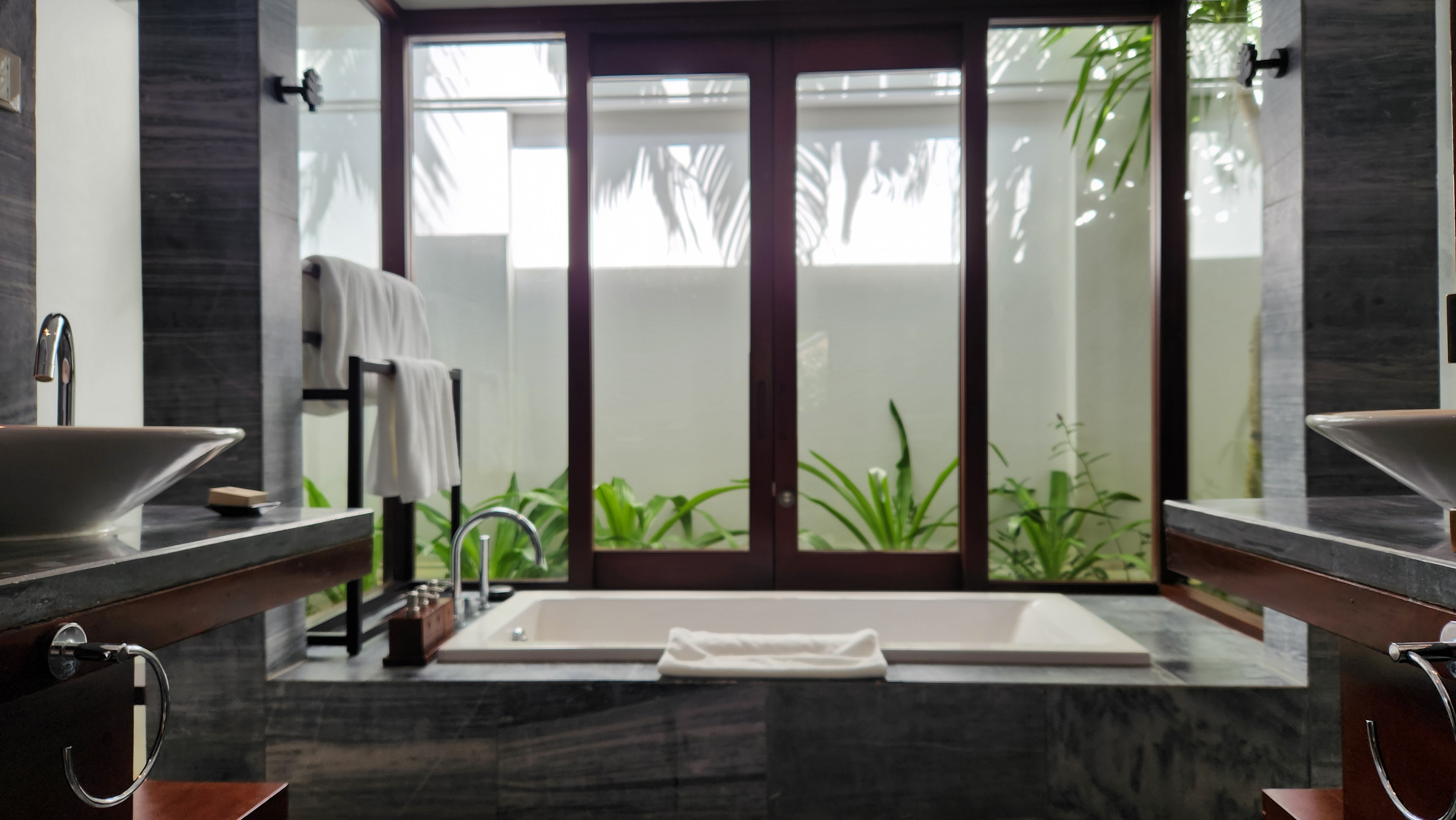 가운데 욕조가 준비되어 있고세면대는 좌우로 두 개 있는데 이게 너무 좋았습니다.