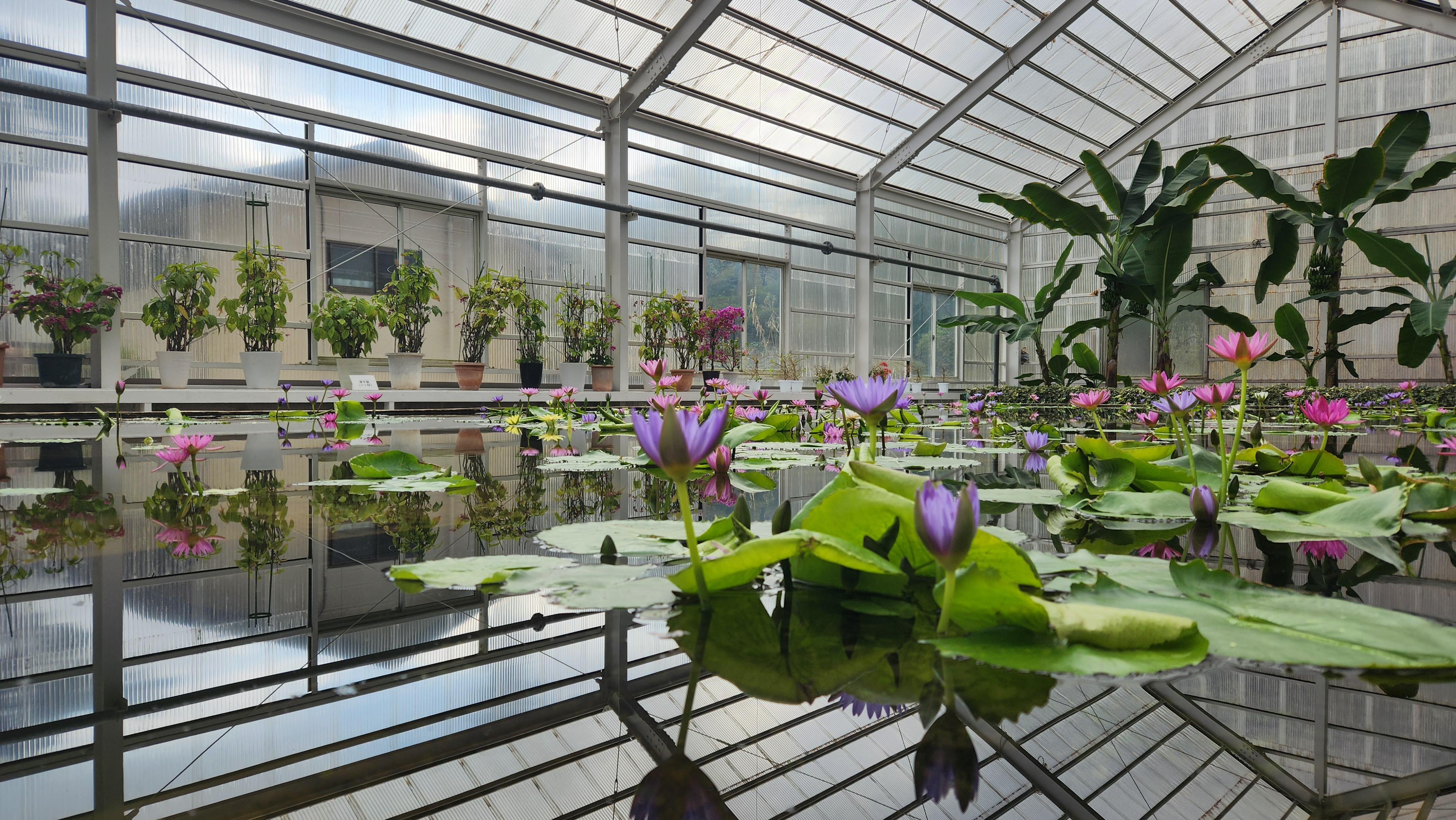 온실에서는 가운데에 연꽃들이 가득하고 주위로 화분에 각종 식물들을 심어서 기르고 있었어요.