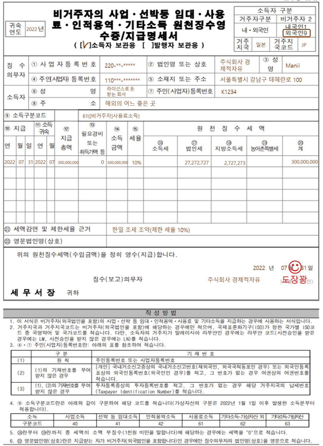 라이선스 마스터가 일본의 회사고 발생한 로열티가 3억이라는 가정하에 아래와 같이 원천징수 영수증을 작성했습니다.