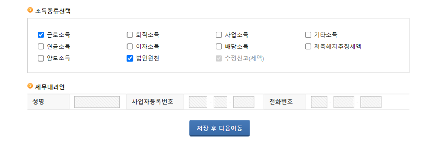 홈택스에 들어가 로그인을 하고 원천세 신고하기에 들어가 기본정보 입력에서 알맞은 소득종류를 선택합니다.