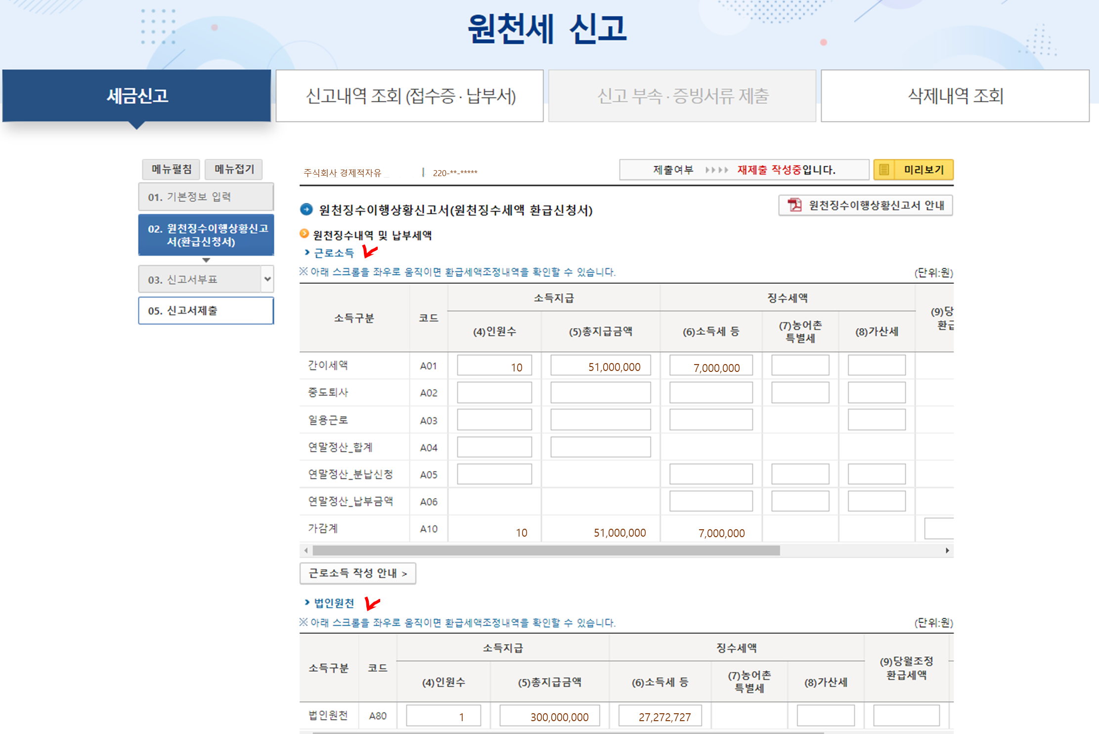 원청징수이행상황신고서에 앞에 선택한 근로소득과 법인 원천소득란이 생성되었습니다.