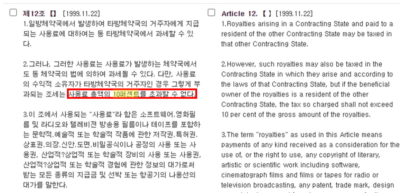 협약에 의해 더 낮은 세율이 적용될 수 도 있기 때문입니다. 실제로 한일협약에서 사용료소득은 10% 제한세율(지방세 포함!)을 적용받고, 한미협약에서는 15% 제한세율을 적용받을 수 있습니다.