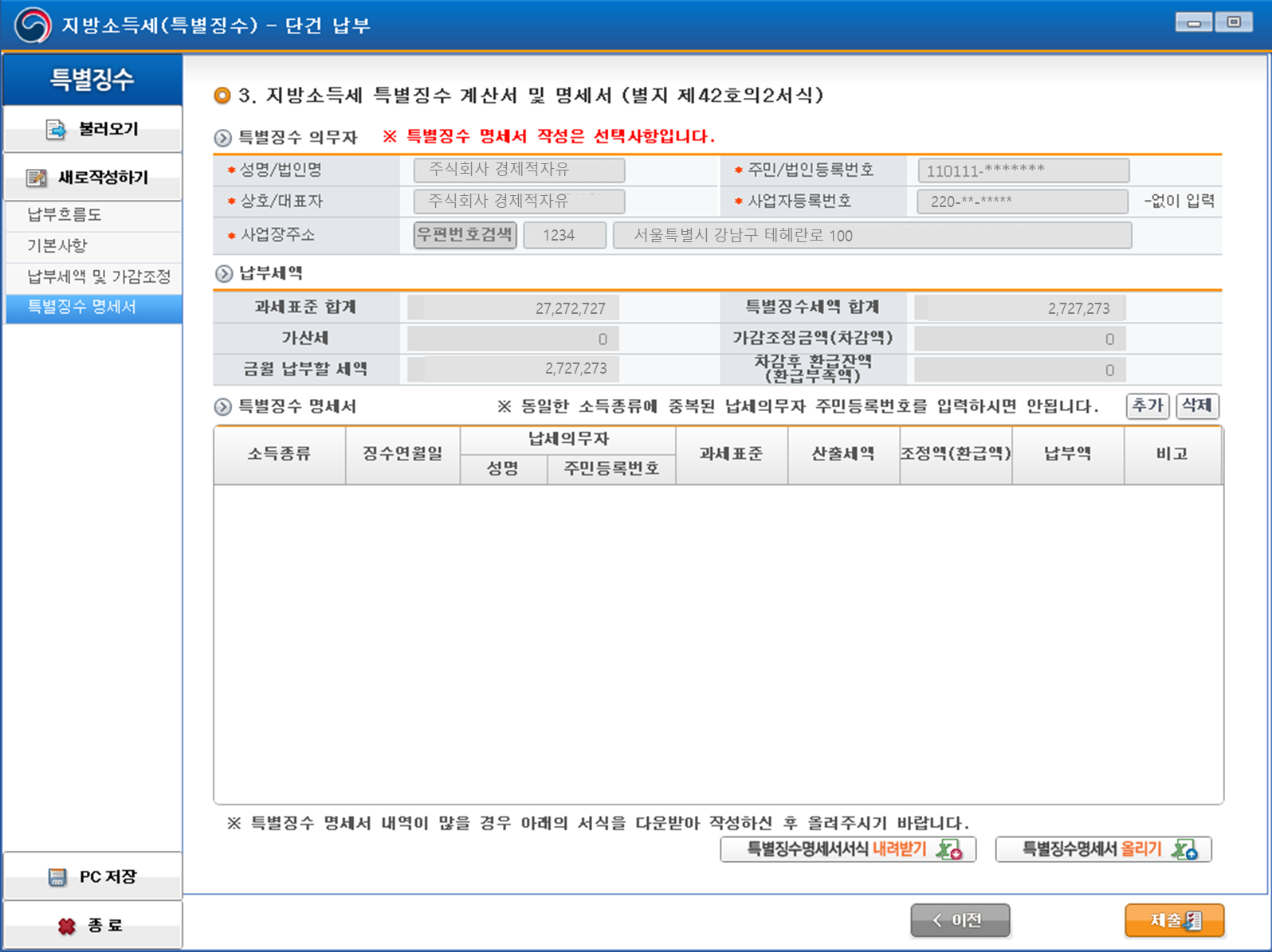 - 과세표준은 국세청에 신고한 소득세 금액이 될것이고, 특별징수세액은 일반적으로 그 소득세 금액의 10%가 될것입니다.