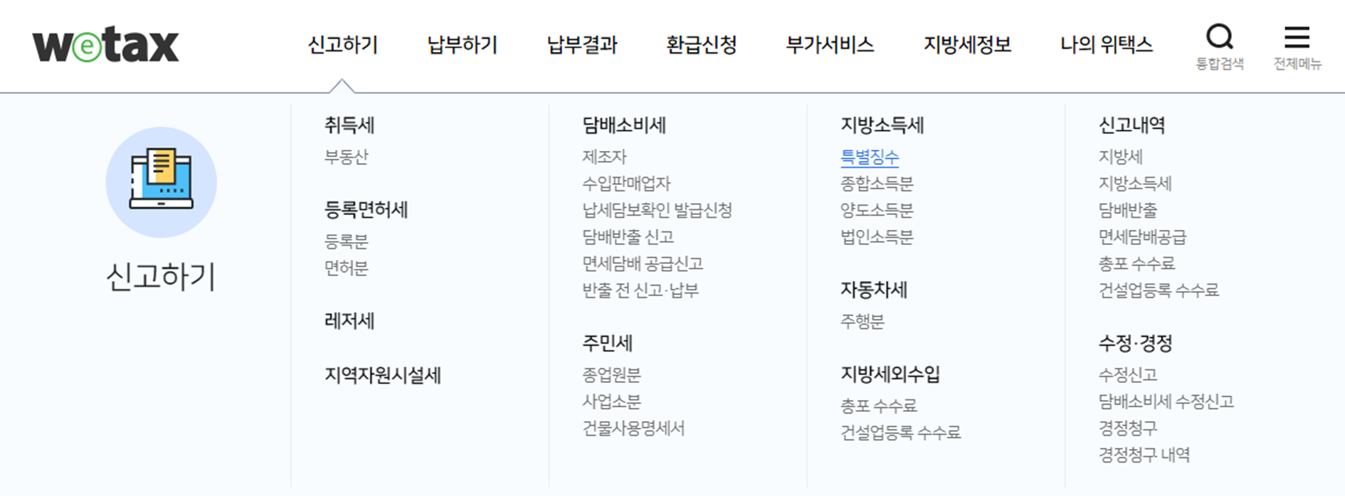 메인 메뉴에서 신고하기>지방소득세>특별징수 를 선택합니다.