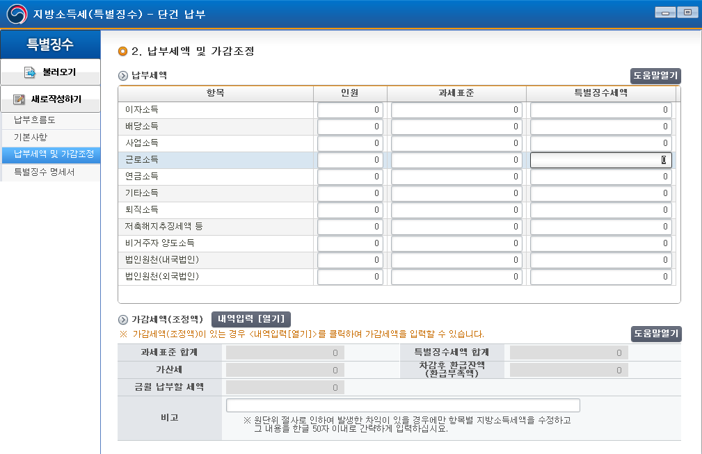 - 과세표준을 넣으면 특별징수세액이 자동계산이 되는데 이 때 회사에서 계산한 지방소득세 금액과 끝수차이가 날 수 있습니다. 단순히 계산 차이인 경우 놀라지 말고 회사에서 계산한 금액으로 넣고 가감세액(조정액) 비고란에 "단수차이로 인한 조정"이라고 넣어주면 됩니다.