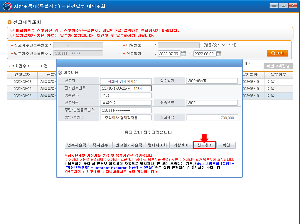 신고 내역 조회에서 취소가 잘 되었는지 한번 다시 확인해 보시고