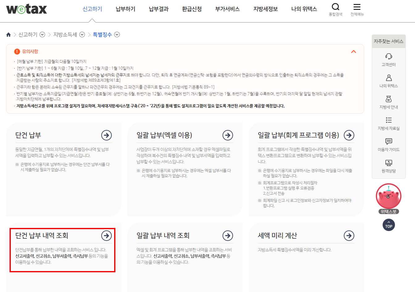 위택스에 접속해 로그인하고 신고하기> 지방소득세> 특별징수에 들어가 아래 "단건납부내역조회"를 클릭합니다.