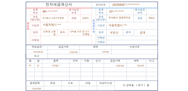 물건 잘 받았고 국세청에 세금계산서 전송까지 잘 끝났습니다! 이제 퇴근해야지 했는데~ 세금계산서가 오백만 원으로 발행되어있는데.... 알고 보니 상품 금액이 백만 원이 었네요??!?!?!? 이런