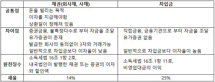 채권과 차입금은 둘 다 자금을 대여하고 이자를 지급해야 한다는 면에서는 공통점이 존재하지만 원천징수 진행 시 다르게 처리해야 하기 때문에 구별이 필요합니다. 보통 증권회사를 통해 유가증권을 발행하면 채권이고, 은행이나 관계사 등을 통해 돈만 빌리는 거면 차입금에 해당됩니다.